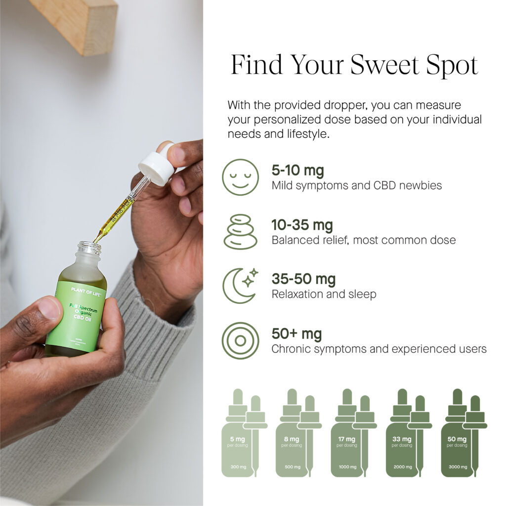 CBD dosage is highly personal depending on your body chemistry, weight, reason for use, etc. We always suggest to start low and go slow as it takes time and consistency for CBD to have noticeable effects. For a more thorough guide on dosing, read more here.